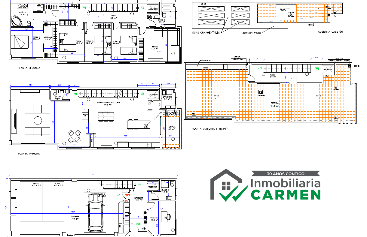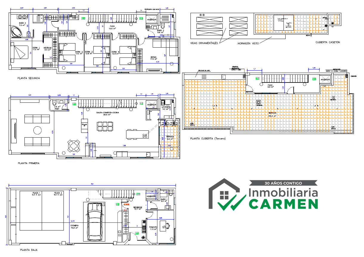 • SEGUNDA PLANTA – Cuatro dormitorios, dos cuartos de baño, sala de estar y vestidor. Superficie construida: 133 m2 .